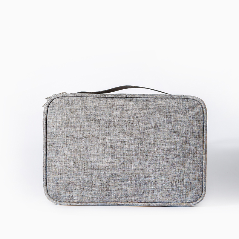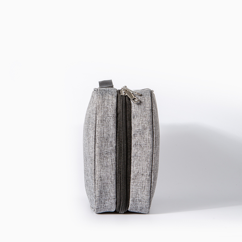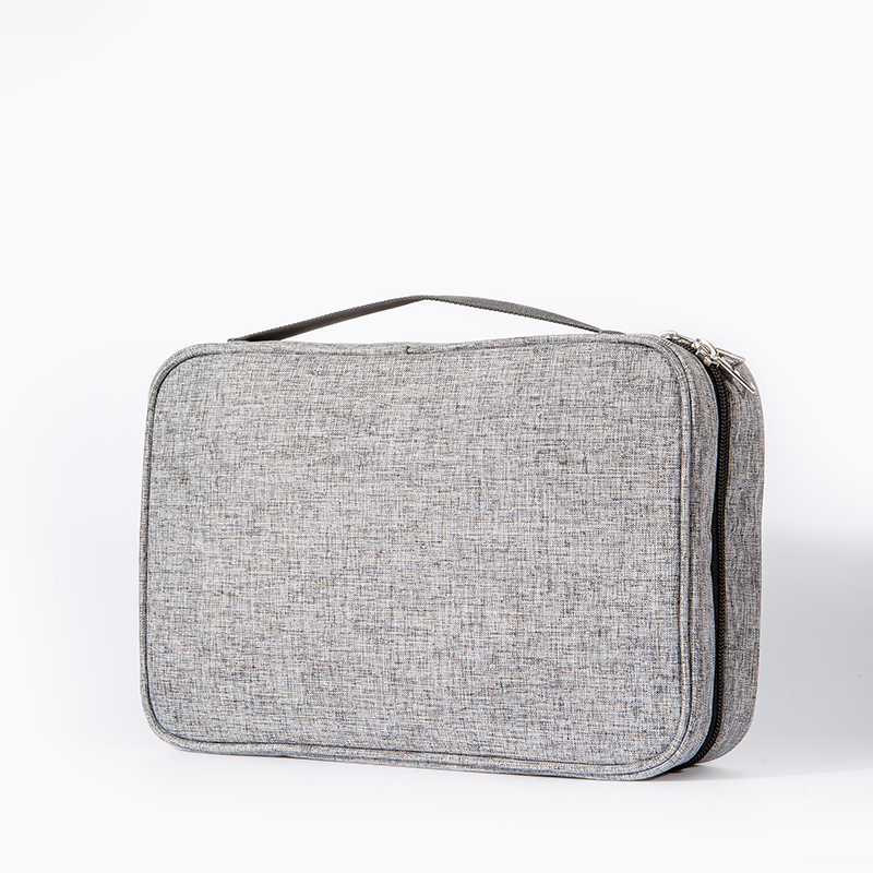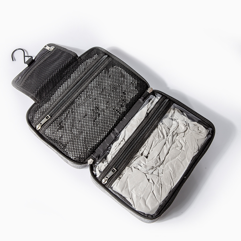 This travel cosmetic bag is made from durable cationic material with excellent wear resistance and water resistance. It features three separate compartments for organized storage and a built-in hook for easy hanging in bathrooms or hotels. Perfect for travel and daily use.