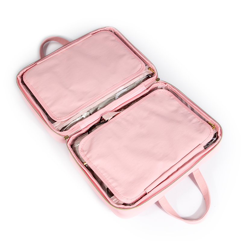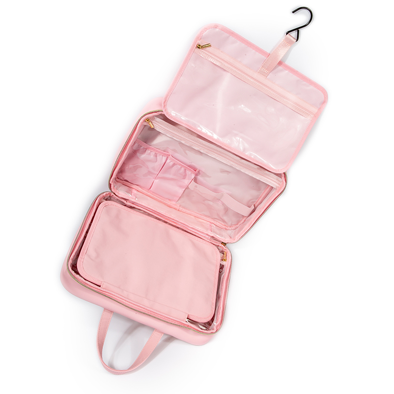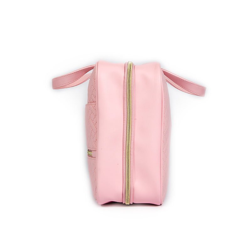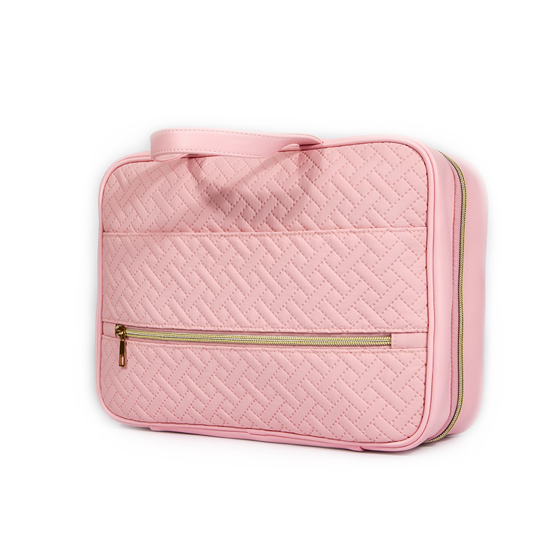 Extra large pink quilted makeup organizer in rectangular shape. Waterproof, soft-touch, and spacious enough for all your cosmetics. Ideal for home or travel use.