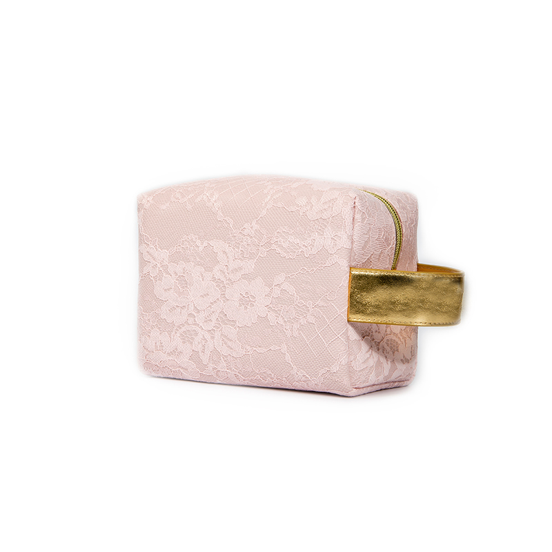 Product description: Chic pink lace PU makeup bag in a square shape with a luxurious gold PU handle. Water-resistant, sturdy, and perfect for daily use or gifting.