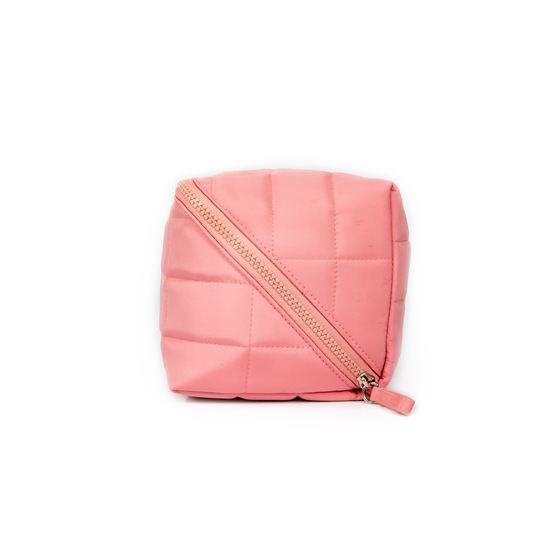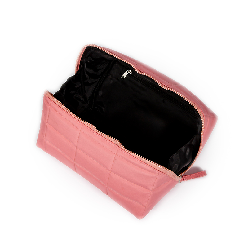 Product description: Extra-large pink pillow-shaped makeup bag with diamond quilting. Shockproof and pressure-resistant design protects your cosmetics. Soft, spacious, and perfect for travel.