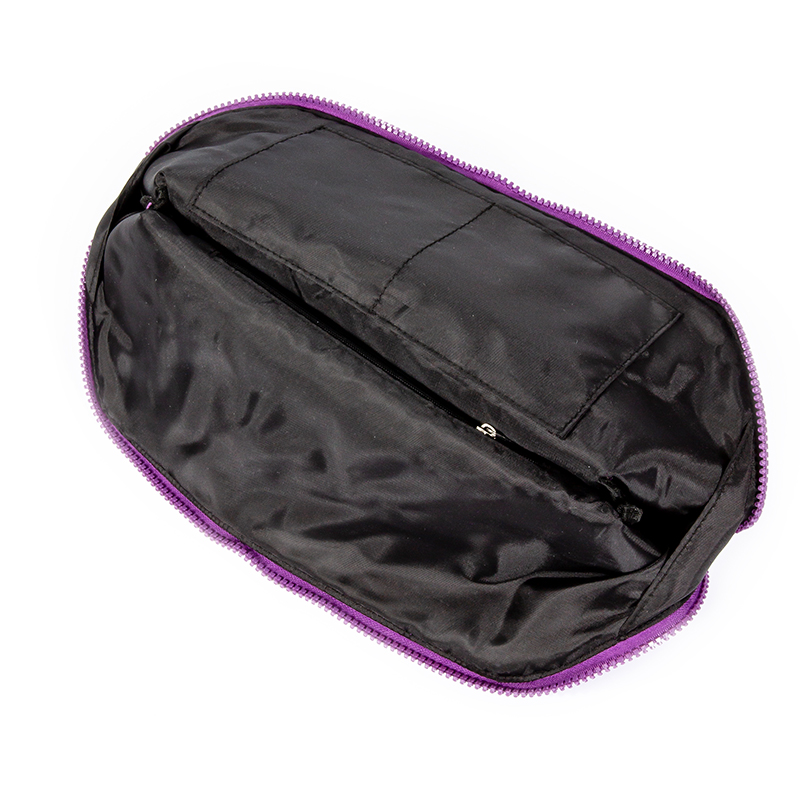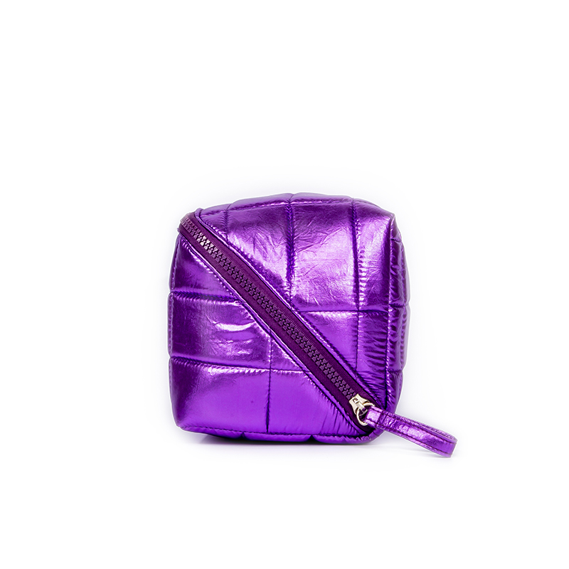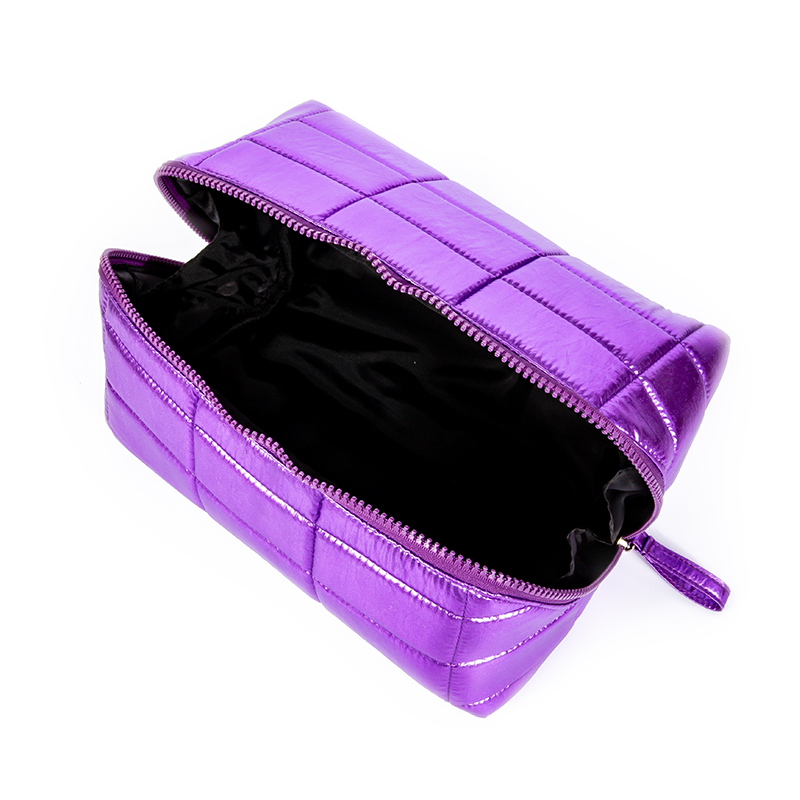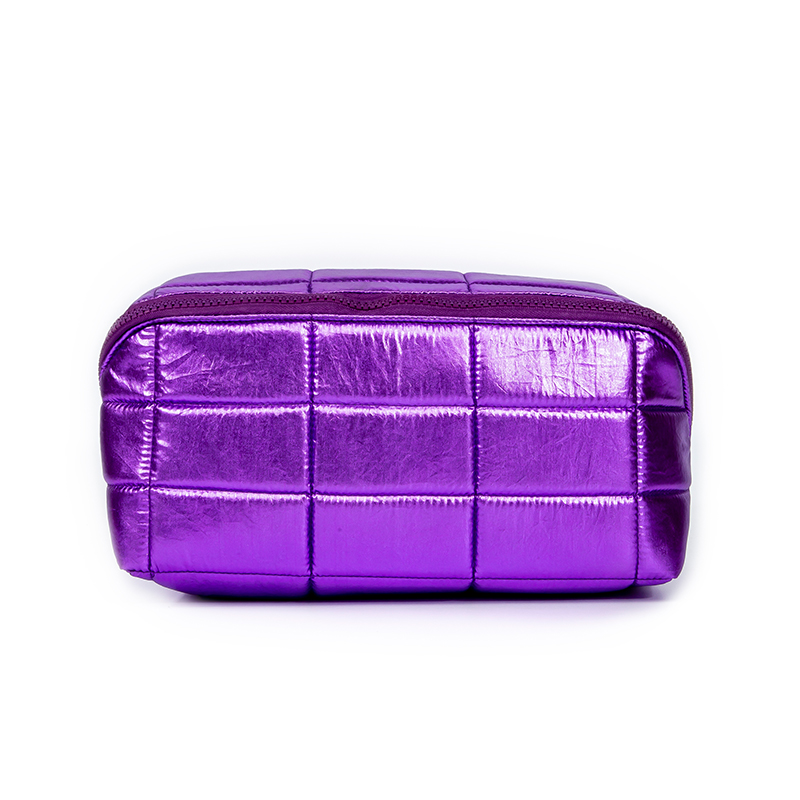Product description: Stunning purple metallic quilted makeup bag with large interior. Lightweight, durable, and eye-catching. Ideal for daily use or weekend travel.